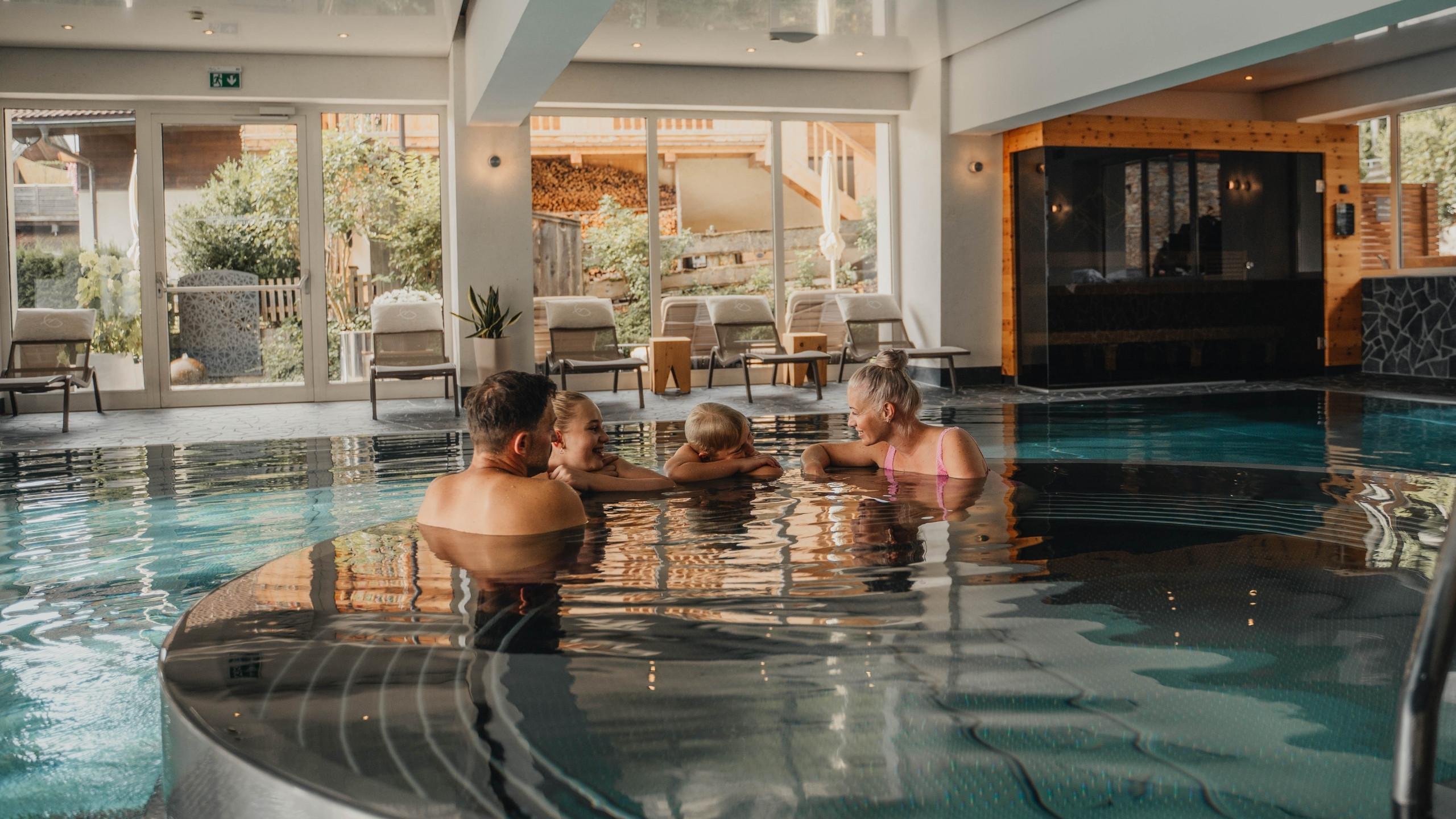 Over 1,200 m² of wellness in the Garden & Crystal SPA: colour-therapy indoor pool, natural outdoor “Mountain Lake”, expansive sauna world and many favourite spots for relaxation