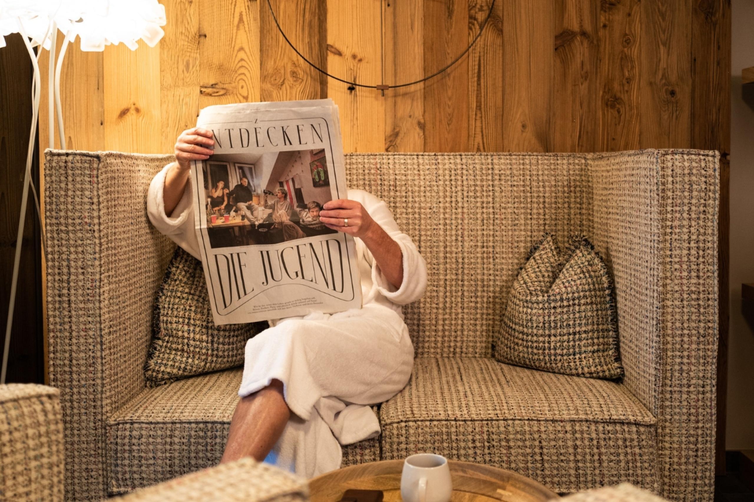 Guest at Hotel Gassner **** Superior reading newspaper on cozy sofa